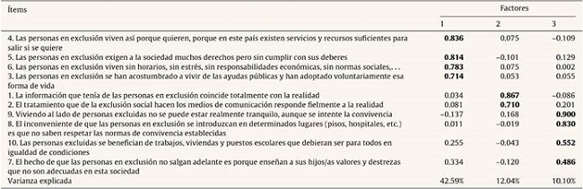 Se utilizó un instrumento de validación propia con 10 ítems (véase la relación en la tabla 1), diseñado a partir de la Escala de Racismo Moderno de McConahay (1986) y McConahay, Hardee y Batts, 1981) en la versión española de García, Navas, Cuadrado y Molero (2003) (α = 0.72), así como de la Escala de Prejuicio Sutil y Manifiesto de Pettigrew y Meertens (1995) en la versión española de Rueda y Navas (1996) (α variable entre 0.79 y 0.87, según las muestras), adaptando estos instrumentos tanto al tipo de participantes (profesionales de servicios sociales o afines) como al grupo objeto de prejuicio (personas en exclusión social) con el fin de contextualizar mejor las motivaciones y conductas percibidas de este grupo, así como potenciales respuestas sociales. La pertinencia, relevancia y claridad de los 31 ítems iniciales de que constaban ambas escalas de partida fueron contrastadas en un grupo de discusión integrado por 5 profesionales con una amplia experiencia en el ámbito de los servicios sociales. Asimismo, en este grupo se exploraron creencias hacia el colectivo de las personas en exclusión social que no se encontraban en las escalas (así, se identificaron nuevas creencias relacionadas con la voluntariedad de la situación de exclusión, con el estilo de vida relajado y sin responsabilidades económicas de las personas excluidas socialmente, con la exigencia de los mismos resultados a personas excluidas y no excluidas cuando se les ayuda con recursos públicos, y con la necesidad de vinculación de los servicios sociales con los judiciales). A partir de las conclusiones obtenidas se redactó una segunda versión del instrumento en la que se prescindía de varios ítems iniciales, se modificaban otros y se añadían reactivos que recogían nuevas creencias relevantes, lo que implicó un cierto distanciamiento de la nueva medida en relación con las 2 escalas originales, reduciéndose la nueva versión a un conjunto de 18 ítems. Esta prueba fue pasada a una muestra piloto de 86 profesionales andaluces que trabajaban con personas en exclusión social, analizándose su fiabilidad y una primera tentativa de estructura factorial. De esta forma, se depuró el instrumento eliminándose los elementos que restaban fiabilidad a la escala y aquellos con reducidas cargas factoriales. En la prueba final permanecieron únicamente 10 ítems, que fueron los sometidos a un análisis más sistemático de fiabilidad y validez de constructo. El formato de respuesta fue tipo Likert de 5 puntos (1 = totalmente en desacuerdo, y 5 = totalmente de acuerdo).