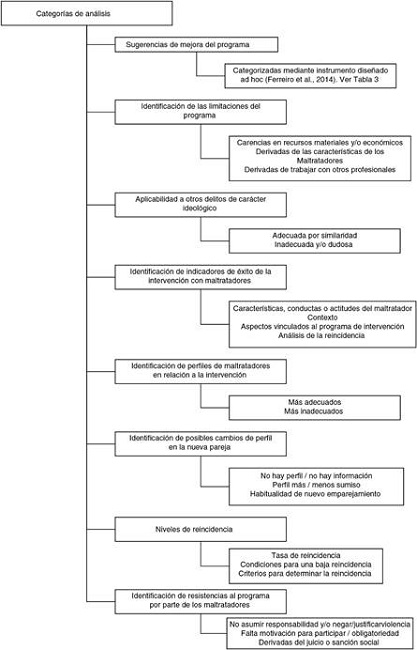 En relación con ello, cabe resaltar que, si bien el número de trabajos sobre programas de intervención con maltratadores en casos de violencia de género, sus características y resultados han ido incrementándose considerablemente a lo largo de los últimos años (Ferrer y Bosch, 2015; Lila, 2013), el número de aquellos centrados en los/as profesionales que los aplican es aún limitado (Langhinrichsen-Rohling, 2010; Saunders, 2008). Entre ellos, y centrándonos en los realizados en España, estarían aquellos que reflexionan sobre las habilidades terapéuticas necesarias para afrontar con éxito este tipo de intervenciones (e.g. Carbajosa, 2010; Carbajosa, Boira y Tomás-Aragonés, 2013) y aquellos otros centrados específicamente en recabar las opiniones y valoraciones de estos/as profesionales (e.g., Boira, Carbajosa y Marcuello, 2013; Boira, López del Hoyo y Tomás-Aragonés, 2010), que constituyen un antecedente del estudio que aquí se presenta. Estos últimos, realizados a partir de grupos de discusión con entre 12 y 14 participantes que trabajaban en un programa o territorio concretos (un programa de medidas penales alternativas en un caso, y una determinada comunidad autónoma en otro), detectaron la preocupación por disponer de programas de intervención diseñados específicamente para aquellos a quienes van dirigidos y sus características, por mejorar las estrategias que permitan aumentar la motivación, la alianza terapéutica y la adherencia de los maltratadores a la intervención, y por mejorar también las estrategias de evaluación de resultados, de modo que aumente la información disponible sobre su eficacia y sea posible valorar de modo más ajustado tanto la efectividad de la intervención como el posible riesgo para las víctimas.