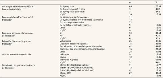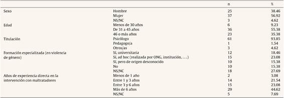En este trabajo participaron un total de 65 personas, que fueron incluidas en su calidad de informantes clave con relación al tema de la investigación dada su experiencia en la implementación y/o gestión y evaluación de programas de intervención aplicados a maltratadores en España. Concretamente, 56 de ellas tenían experiencia profesional directa en la implementación de programas de este tipo (86.15%), y, en cuanto al rol o roles desempeñados, 48 de ellas (73.85%) habían participado como terapeutas, 16 tenían experiencia como coordinadores/as de programas (24.62%), 4 como directores/as (6.15%), y 5 como investigadores/as, asesores/as y/o colaboradores/as (7.70%).