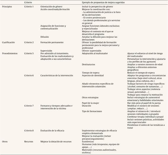 Por otra parte, casi 2/3 partes de las personas participantes (61.54%) consideraron que aquellos programas de intervención en los que habían participado eran mejorables. El análisis de las propuestas mostró que estas se corresponden, básicamente, con las descritas en los estándares de calidad al uso, por lo que se agruparon empleando la herramienta previamente diseñada para analizar dichos estándares (Ferreiro et al., 2014). Los resultados obtenidos se presentan en la tabla 3.