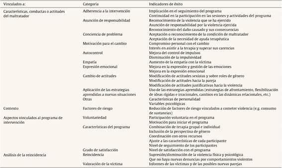 Los indicadores más fiables de éxito para los programas de intervención con maltratadores en casos de violencia de género descritos por los/as participantes se presentan en la tabla 4 y se agrupan en: características del contexto, de los programas de intervención, de la medición de la reincidencia, y del maltratador y sus conductas o actitudes. Destaca el hecho de que estos últimos son los descritos con mayor detalle y en mayor número.