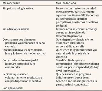 Igualmente, otra conclusión importante apuntada en trabajos previos (Boira et al., 2010, 2013; Echeburúa, 2013) es que ciertas características de los participantes y/o de los programas aplicados desempeñan un papel importante en las posibilidades de cambio o, en su caso, en el mantenimiento de la violencia. Particularmente, el trabajo de Boira et al. (2010) mostró que, si bien los/as participantes no tenían una opinión clara sobre el efecto concreto de tales características, consideraban que factores como la presencia de psicopatología deberían ser considerados criterios de exclusión para participar en este tipo de programas.