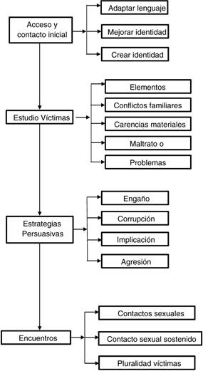 O’Connell (2003) sugirió un modelo del proceso de grooming online basado en estadios organizados de manera secuencial. El análisis provenía de conversaciones entre un investigador que se hacía pasar por diferentes menores de entre 8 y 12 años para interactuar con potenciales abusadores sexuales. El estudio sugirió una progresión en fases a la hora de iniciar y mantener la relación, con diferentes elementos persuasivos propios de cada estadio: formación de amistad, desarrollo de la relación, evaluación de riesgo, exclusividad y etapa sexual. Sin embargo, estudios posteriores han examinado la progresión elaborada por O’Connell, apareciendo inconsistencias que reflejaban la no linealidad y/o universalidad de los elementos del modelo (Black, Wollis, Woodworth y Hancock, 2015; Williams, Elliott y Beech, 2013). En el trabajo de Black et al. (2015) se realizó un análisis de contenido computarizado en transcripciones de delincuentes condenados, para analizar el lenguaje utilizado en los diferentes estadios propuestos por O’Connell (2003) y examinar la frecuencia de técnicas de persuasión específicas utilizadas, tanto en grooming online como offline. Las estrategias utilizadas con mayor frecuencia son: evaluar la localización del objetivo, intentar hacer planes para reunirse, utilizar halagos y cumplidos y evaluar el horario de trabajo de los padres (Black et al., 2015).