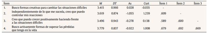 Brief Resilient Coping Scale (BRCS; Sinclair y Wallston, 2004). Medida unidimensional compuesta por cuatro ítems que evalúan la capacidad para hacer frente al estrés de manera adaptativa. La versión original de Sinclair y Wallston (2004) presentó un valor del coeficiente alfa de Cronbach, como medida de consistencia interna, de .69, un coeficiente de correlación test-retest de .71 y buenos índices de bondad de ajuste (χ2 = 2.13, p = .03, CFI = .99, SRMR = .02 y RMSEA = .01). Los ítems puntúan en una escala tipo Likert desde 1 (no me describe en absoluto) a 5 (me describe muy bien), donde las puntuaciones oscilan entre 4 y 20. Para este estudio se usó la traducción realizada por Limonero et al. (2014).