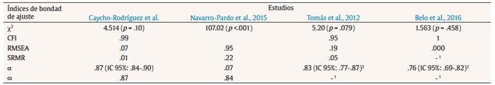 Asimismo, en la Tabla 2 se presenta la comparación de los índices de bondad de ajuste con estudios previos, evidenciando la superioridad con respecto a los hallazgos de Navarro-Pardo et al. (2015) y Tomás et al. (2012). No obstante, los resultados de Belo et al. (2016) son superiores a los aquí encontrados, aunque no se cuenta con los valores de GFI y SRMR para establecer una comparación clara.