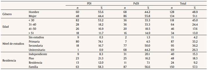 La muestra total estudiada estuvo formada por un total de 262 adultos de entre 20 y 74 años (M = 35, DT = 13.11), casi el 49% fueron hombres y algo más del 51% mujeres. Del conjunto de la muestra, 108 participantes tenían DI leve (CI entre 50-69) y 154 no tenía DI. En la Tabla 1 se recogen los datos sociodemográficos de cada uno de los grupos de estudio y del conjunto de la muestra.