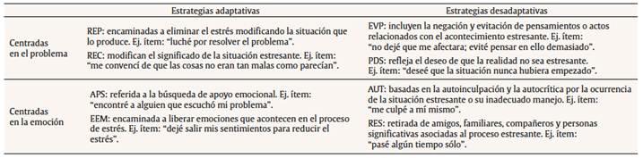 El Inventario de Estrategias de Afrontamiento (Coping Strategies Inventory, CSI; Tobin, Holroyd, Reynolds y Wigal, 1989) fue adaptado al español por Cano et al. (2007). El inventario se divide en dos partes: la primera consiste en describir detalladamente una situación estresante vivida recientemente y la segunda está formada por 40 ítems, tipo Likert de cinco puntos, que miden el grado de utilización de las ocho estrategias de afrontamiento en la situación relatada anteriormente (0 = en absoluto, 1 = un poco, 2 = bastante, 3 = mucho, 4 = totalmente). En la Tabla 2, se incluye un ejemplo de ítem en cada una de las estrategias de afrontamiento que evalúa el instrumento: resolución de problemas, autocrítica, expresión emocional, pensamiento desiderativo, apoyo social, reestructuración cognitiva, evitación de problemas y retirada social. Estas estrategias se agrupan en las dimensiones propuestas por Folkman y Lazarus (1985), clasificándolas en estrategias de afrontamiento centradas en el problema o en la emoción y estrategias adaptativas o desadaptativas (Tabla 2).