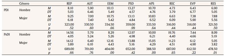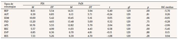 Al comparar las medias de las puntuaciones obtenidas en las estrategias del inventario, agrupadas en estrategias centradas en el problema o bien centradas en la emoción, según la clasificación propuesta por Folkman y Lazarus (1985) (Tabla 2), se pudo observar que existían diferencias significativas únicamente en las estrategias centradas en el problema (t = 6.03, p < .000, gl = 129, 95% IC [7.57, 14.97]) y no en las centradas en la emoción (t = .44, p = .660, gl = 129, 95% IC [-3.12, -4.93]). Puntuaron más alto las personas sin discapacidad (M = 45.51, DT = 15.02) que con DI (M = 34.22, DT = 12.19).