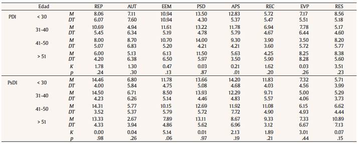 En cuanto a la edad (Tabla 4), se encontró que únicamente existían diferencias en el grupo de personas con DI en la estrategia de afrontamiento del estrés: apoyo social. En esta estrategia, las puntuaciones medias de los participantes de este grupo iban disminuyendo conforme avanzaba la edad; en el rango de menores de 30 años se obtuvieron las puntuaciones más altas, entre los 31-40 años los valores disminuyeron, y también entre los 41-50 años, siendo los mayores de 51 años los que obtuvieron las puntuaciones más bajas. Para estudiar la significatividad de las diferencias entre rangos de edad, se utilizó la prueba U de Mann Whitney. Los resultados indican que éstas existen entre los más mayores (> 51 años) y los dos grupos de participantes más jóvenes: < 30 años (U = 84.00, p = .000) y entre 31-40 años (U = 106.00, p = .000). En el resto de estrategias de afrontamiento no se encontraron diferencias significativas.