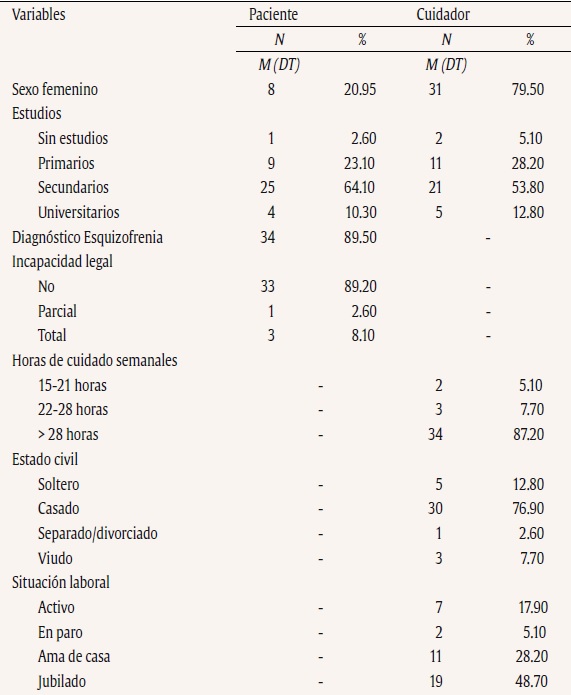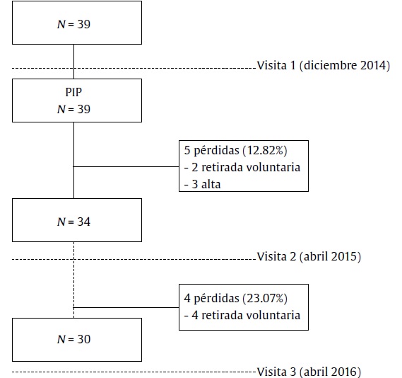 Un total de 39 diadas (paciente-cuidador) participaron en el estudio durante los meses de diciembre de 2014 a mayo de 2016. Treinta y cuatro sujetos completaron la segunda visita. De las 5 pérdidas (12.82%), 2 (5.12%) fueron por retiradas voluntarias del cuidador y 3 (7.69%) por altas asistenciales del paciente en el recurso ambulatorio. En la última visita hubo 4 nuevas pérdidas, todas ellas debido a retiradas voluntarias. No se produjo ninguna pérdida por posibles desviaciones del protocolo. La Figura 1 presenta el flujograma de la muestra.