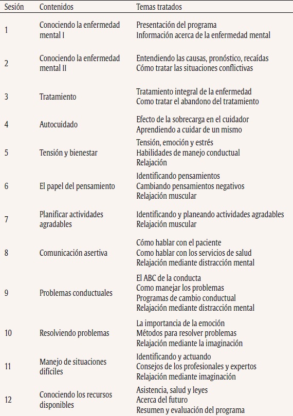 Durante las sesiones los cuidadores recibían información estandarizada acerca del curso natural de la enfermedad, así como entrenamiento en el uso de habilidades generales de cuidado, mejora de comunicación, búsqueda de actividades agradables, búsqueda de apoyo y entrenamiento activo en técnicas de relajación.