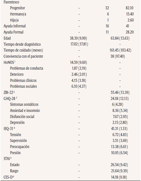 Según muestra la Tabla 2, los pacientes del estudio fueron en su mayoría hombres, con una edad media de 38.39 años y con un tiempo medio de 17.02 años de evolución de enfermedad desde el diagnóstico. El 89.5% de los pacientes estaban diagnosticados de esquizofrenia. La puntuación media de la escala de HoNOS fue de 14.79 (DT = 10.13) puntos. La mayor problemática en esta escala se detectó en los problemas sociales (M = 6.35, DT = 4.95), seguida de los problemas clínicos (M = 3.94, DT = 3.16).