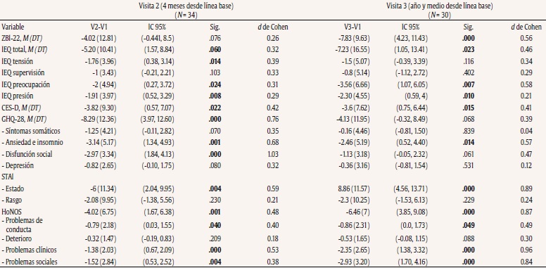 Tanto en la ZBI como en la IEQ, puntuaciones altas significan mayor nivel de sobrecarga, y por ello un resultado negativo en la medición del cambio se interpreta como una mejoría.