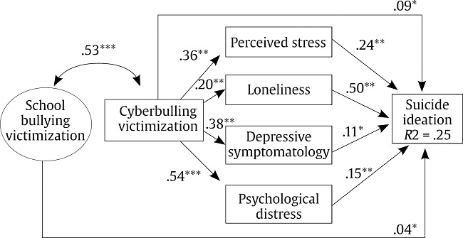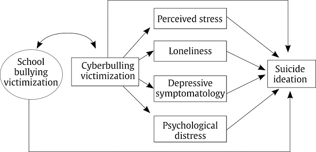 The main goal of the present study was to analyze the relationships between cyberbullying victimization and suicide ideation in adolescents. The results suggest that cybervictimization has a direct effect on suicide ideation. Likewise, they show that cybervictimization has an indirect effect on suicide ideation through perceived stress, loneliness, depressive symptomatology, and psychological distress. Moreover, the first hypothesis of our study was confirmed, which proposed that cyberbullying and school bullying victimization were directly related to each other. This result coincides with numerous scientific studies that show the existence of a continuity between school bullying and cyberbullying victimization (Giumetti & Kowalski, 2016; Kowalsky & Limber, 2013; Yubero, Navarro, Elche, Larrañaga, & Ovejero, 2017). As Hemphill et al. (2012) indicate, school bullying victimization is a risk factor that increases a victim's probability of being a target of bullying in another context, in this case, the virtual environment.