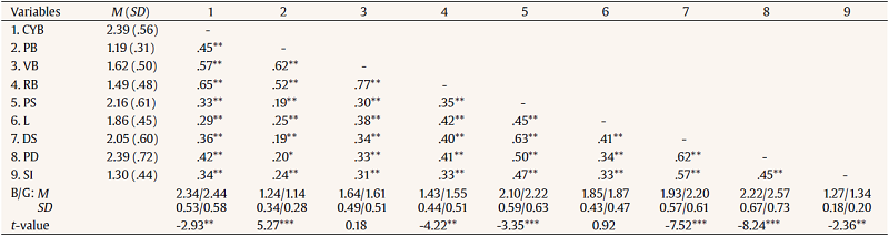 Table 1 presents the correlations matrix of the study variables, as well as the means, standard deviations, and Student's t-test results based on gender.