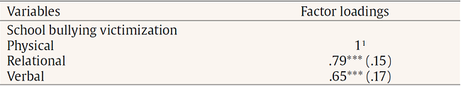 Later, a structural equation modeling was calculated with the purpose of analyzing the effects of cyberbullying victimization on suicide ideation, also taking into account the direct influence of school bullying victimization on the final variable. The calculated model is composed of six observable variables (cyberbullying, perceived stress, loneliness, depressive symptomatology, psychological distress, and suicide ideation) and a latent factor (school bullying victimization) formed by the observable variables of physical bullying victimization, relational bullying victimization, and verbal bullying victimization. Their factor saturations are shown in Table 2.