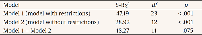 Finally, a multigroup analysis was carried out to test the structural invariance of the calculated model based on gender (boys and girls). For this purpose, two models were compared: the first, with constrictions, assumes that all the relationships between the variables are equal for boys and girls, whereas the second model, without constrictions, estimates all the coefficients in both groups. If the statistical comparison of the two models reveals no differences between them, the model with more degrees of freedom is the most appropriate. As Table 3 shows, no significant differences were found between the model with no restrictions and the restricted model, S-Bc2 (11, 1062) = 18.27, p = .075. Thus, the model with restrictions was found to be statistically equivalent for both groups.