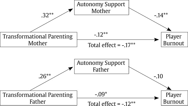 In addition, when testing families, our results suggest a negative and significant association between transformational parenting and burnout, partially mediated by autonomy support by mothers, but not by fathers, and a positive and significant association between transformational parenting and autonomy support by mothers and fathers. Thus, our results suggest an impact of mothers' autonomy support on their adolescent children's burnout, which did not exist for fathers. Our results are aligned with previous research suggesting that perceptions of an autonomy-supportive environment contributed to reducing players' burnout (e.g., González et al., 2017), and reinforce results revealing that adolescent players perceived that their mothers play a differential role in their sport development (Palomo-Nieto et al., 2011).