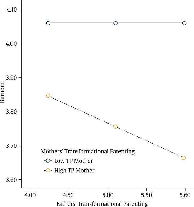 In relation to autonomy support, our results also suggest a major role of the mother over the father in explaining their children's burnout, when mothers' and fathers' transformational parenting behaviours were considered together. Therefore, mothers' autonomy support is the only factor that is negatively associated with athletes' burnout. These results invite us to explore whether there was an interaction effect between transformational parenting behaviours of mothers and fathers. Modulation effects showed that when mothers' transformational parenting levels were high, fathers' transformational parenting was significantly and negatively associated with children's burnout, but when mothers' transformational parenting levels were low, the effects of fathers' transformational parenting on children' burnout disappeared. Mothers' role had been identified as a catalyser of the father-child relationship (Harrington, 2006). As Palomo-Nieto et al. (2011) pointed out, mothers have a central role in their children's emotionality, which makes them largely responsible for the psychological and social support of their children (e.g., Pedro, Altafim, & Linhares, 2017).