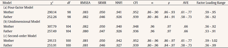 The descriptive statistics are offered in Table 1. EFA results for both versions showed a one-factor solution that accounted for 52.9% of the common variance for fathers' version and 42.3% for mothers' version. The scale showed good internal consistency for both mother (α = .92, AVE = .42, = .92) and father versions (α = .95, AVE =.53, = .95).