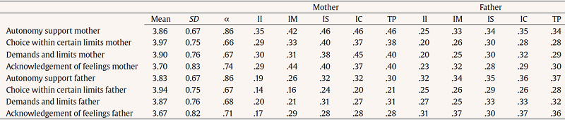 Table 3 shows descriptive statistics, reliability indices, and correlations among TPQ scale and subscales (mother and father versions). The four subscales were found to be highly correlated for both mother (.81> r > .76) and father versions (.84 > r > .80). These inter-factor correlations below .85 support factor discrimination (Kline, 2011).