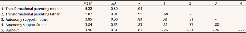 Before testing the mediation effects, a Pearson's correlation analysis was conducted with transformational parenting (mother and father), autonomy support (mother and father), and players' sport burnout (see Table 5). As expected, a positive correlation was found between transformational parenting and autonomy support, and negative relationships between these variables and burnout, for both mothers and fathers.