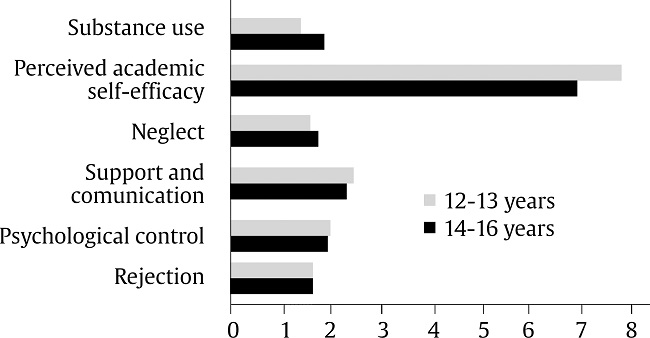 In summary, the comparison of early and middle adolescence shows that substance use and parents’ neglect are higher in middle adolescence. In contrast, parents’ support and communication and students’ perceived academic efficacy are lower (Figure 1).