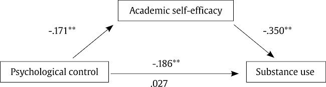 In this mediation model, psychological control is significant at the .05 significance level as a predictor of substance use, β = .086, t(751) = 2.369, p < .05. The relationship of this predictor variable is not significant when academic self-efficacy is included, β = .027, t(750) = 0.779, p = .436, and the relationship is significant only for academic self-efficacy, β = -.345, t(750) = -9.954, p < .001. This result shows the mediating role of academic self-efficacy in the relationship between parents’ psychological control and substance use.