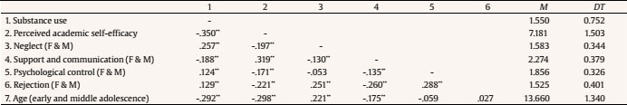 The analysis of differences of means between the two subsamples using the Student’s t test highlights significant differences in substance use between early and middle adolescence. Older adolescents tend to have greater substance use: 12-13 years, M = 1.32, SD = 0.49; 14-16 years, M = 1.76, SD = 0.88; t(751) = -8.36, p < .001, Cohen’s d = -0.61. Parents’ neglect is also higher: 12-13 years, M = 1.50, SD = 0.29; 14-16 years, M = 1.65, SD = 0.36; t(751) = -6.20, p < .001, Cohen’s d = - 0.45. In contrast, older adolescents report lower perceived academic self-efficacy: 12-13 years, M = 7.63, SD = 1.52; 14-16 years, M = 6.73, SD = 1.83; t(751) = 8.56, p < .001, Cohen’s d = 0.53; also parents’ support and communication: 12-13 years, M = 2.34, SD = 0.35; 14-16 years, M = 2.20, SD = 0.39; t(751) = 4.87, p < .001, Cohen’s d = 0.37. There are no differences for parents’ psychological control or rejection.