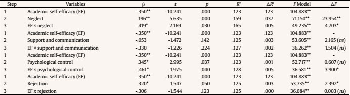 Following the recommendations by Aiken and West (1991) for hierarchical regression analysis, we introduced the variables in the following order: first, predictor variables (i.e., academic self-efficacy and parenting style), then, each of the variables corresponding to the parenting styles multiplied by the moderating variable (academic self-efficacy). In this case, a significant regression coefficient in the explained variance implies that there is moderation.