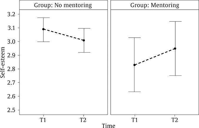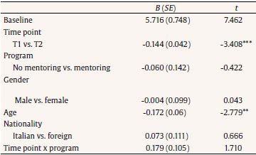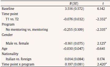 Table 2 presents the results of the linear mixed-effects model for self-esteem. Self-esteem decreased as function of time point, B = -0.07, t(207) = -2.33, p = .02, and program, B = -0.25, t(268) = -2.33, p = .02. The covariate gender was also significant, B = -0.161, t(204) = 2.12, p = .03, males (gender =1) showing lower levels of self-esteem than females (gender = 2). The interaction between time point and program (Figure 1) revealed a significant effect on self-esteem, B = -0.197, t(204) = 2.42, p = .01. In particular, there was an increase in self-esteem over time for participants who attended the mentoring program. On the contrary, subjects who did not attend the program showed lower levels of self-esteem at the end of the study.