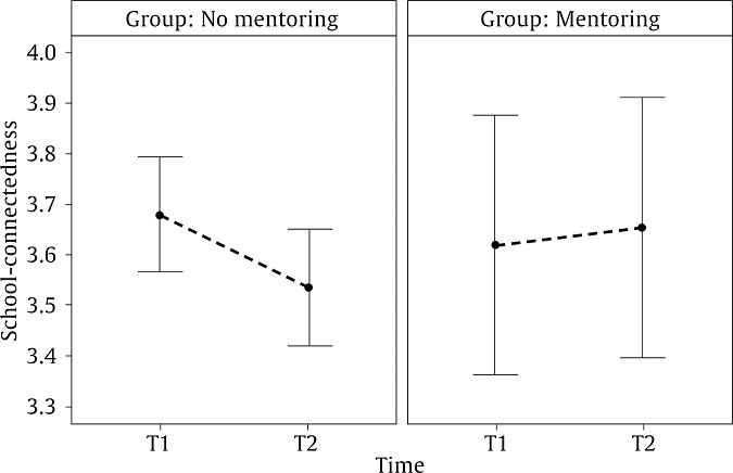 Regarding school connectedness, we did not find a significant difference in the levels of school connectedness in mentees who participated in the Mentor-UP program. A possible explanation is that a seven-month program is not enough to have an impact on school connectedness and longer relationships are needed for promoting more cohesive ties in the school setting (Dubois et al., 2011). Another explanation is that the Mentor-UP program integrates elements of school and community-based mentoring programs (in this program, in particular, mentors dedicated most of the time to extracurricular activities in the community, as compared to school activities, with a ratio of approximately 4:1). This implies that the program was not specifically and explicitly designed for improving school relationships. Although many of the mentor-mentee activities were carried out in the school setting and mentors worked with mentees in order to improve their social skills, this may not have been enough to change the overall social climate in the school. Interestingly, in mentees classmates who did not participate in the program there was a decrease in both self-esteem and school connectedness between the beginning of the school year and the end of it. This is consistent with previous literature that found a decrease in self-esteem and school connectedness over time, in particular during the transition between primary and middle school and between middle school and high school (Eccles & Midgley, 1990; Wigfield, Eccles, Mac Iver, Reuman, & Midgley, 1991).