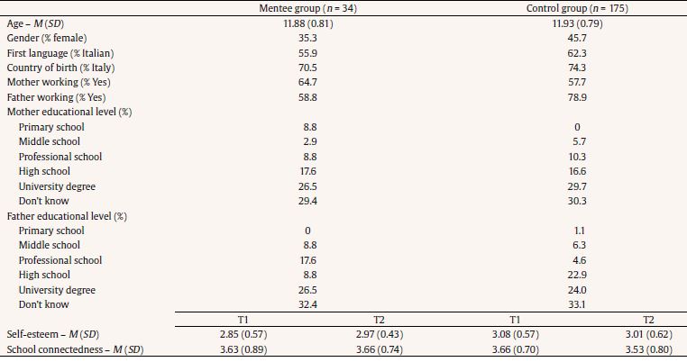 Our final sample was composed of 209 youths, 34 in the experimental group (mentees) and 175 as a comparison group, comparable in terms of gender, 2(1) = 1.254, p = .26, age, t(207) = 0.292, p=.77, and immigrant status, 2(1) = 0.640, p = .42. Their ages ranged between 11 and 13 years old (M = 11.92, SD = 0.789), 56% were male and 26.8% were immigrants.