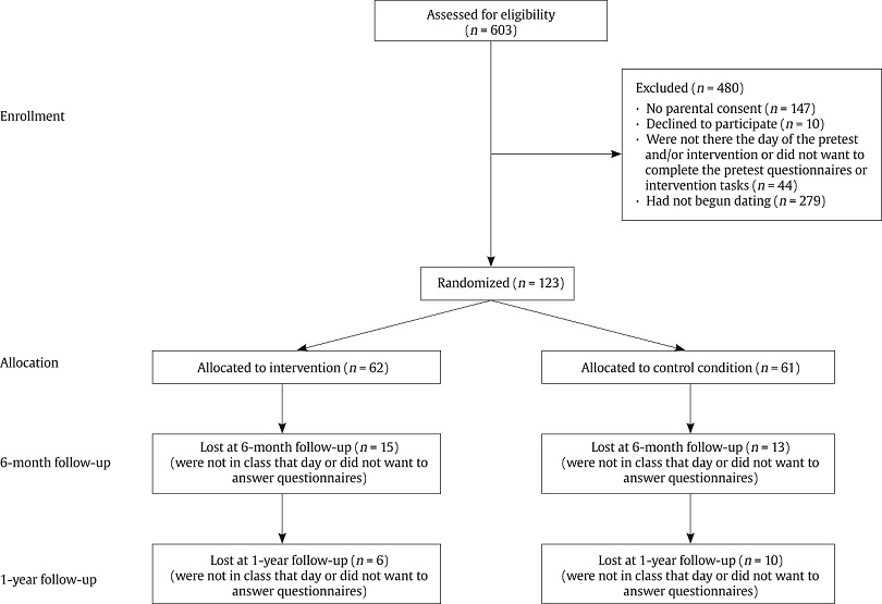 We conducted a double-blind randomized controlled trial (RCT) with two parallel groups (experimental vs. control). Recruitment was carried out via educational centers. We invited a random sample of 20 school headmasters from all high schools in Bizkaia (Basque Country, Spain) to participate in the study. Of them, the headmasters of ten schools agreed to participate and four schools were randomly selected for this study, which is part of a larger research project aimed at assessing the effect of the ITP intervention on several internalizing and externalizing problems. Eligible participants were those who were enrolled in any of the four high schools and who spoke Spanish or Basque fluently (N = 603). Informed consent was required both from parents and adolescents. Ten adolescents declined to participate in the study, and 147 parents did not provide consent. Moreover, 44 adolescents were excluded from the study because they were not in class on the days of the pretest and/or intervention, and 279 adolescents were excluded because they had not begun dating (see Figure 1). Randomization took place on the day of the intervention and was done at individual level within each classroom, blocked by sex. Allocation was concealed to participants, researchers, and teachers. Participants completed task interventions on paper individually, and assessment measures were administered one week prior to the intervention (pretest), one week after the intervention (post-test), six months after the intervention (6-month follow-up), and one year after the intervention (1-year follow-up). Because of the short time frame of the post-test (see Measures section), the resulting behavioral assessment of dating aggression at the post-test was not comparable to the measures obtained in the other waves, and therefore it was not used for this studys analyses. Both interventions and assessment measures were administered by research assistants during normal class time (clinicaltrials.gov identifier NCT03583645). The Ethics Committee of the University of Deusto approved this study and confidentiality was guaranteed.
