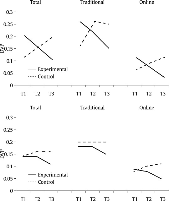 Finally, we did not find a moderator effect of participants sex on the effect of the ITP intervention. As mentioned, DV during adolescence is predominantly bidirectional, with similar prevalence rates of physical and emotional aggression for both sexes, or even higher rates for girls (e.g., OLeary et al., 2008). Sex comparisons for the sample of adolescents of the present study revealed nonsignificant differences for DVP, although boys reported more acts of DVV than girls, mainly online aggressions committed through new technologies, such as for instance, using the partners passwords (phone, social networking, email) to browse through their messages and/or contacts without permission. The reciprocal pattern of partner aggression during adolescent dating relationships and the lack of a gender-specific association of adolescence with being exclusively a perpetrator or a victim may explain the similar effect of the intervention both for girls and boys. Moreover, these sex results are consistent with those found in the previous study of Yeager et al. (2011) for peer aggression, which leads to the conclusion that the effect of the ITP intervention on externalizing problems is similar for boys and girls.