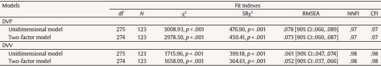 The DV scale showed adequate psychometric properties. Specifically, the factor structure was examined through confirmatory factor analysis (CFA) with LISREL 8.8 (Jöreskog & Sörbom, 2006). We used the robust maximum likelihood (RML) method, which requires an estimate of the asymptotic covariance matrix of the sample variances and covariances and includes the Satorra-Bentler scaled 2 index (S-B2). A correlated two-factor (traditional and online aggression) model was tested both for DVP and DVV. Each item loaded exclusively on one factor, and the measurement error terms associated with each item were uncorrelated. The fit indices obtained for the two-factor solution were acceptable both for DVP and DVV (see Table 1). The covariance between the two factors was .91 (p < .001) for DVP and .87 (p < .001) for DVV. We also tested a unidimensional model in which all the items were explained by only one factor. This model also showed adequate fit indices both for DVP and DVV (see Table 1), although worse than those obtained for the two-factor models. The unidimensional model increased chi-squared significantly both for DVP, 2(1, N = 123) = 21.43, p < .001; and DVV, 2(1, N = 123) = 57.87, p < .001. Therefore, the two-factor model, which includes the differentiation between the two types of aggression (i.e., traditional and cyber dating abuse) was considered preferable. Finally, reliability was examined. Cronbachs alphas for this studys sample at pretest, 6-month follow-up, and 1-year follow-up, respectively, were .91, .97, and .90 for DVP total score; .83, .93, and .88 for traditional DVP; .90, .94, and .78 for online DVP; .93, .94, and .93 for DVV total score; .88, .92, and .89 for traditional DVV; and .88, .93, and .85 for online DVV.