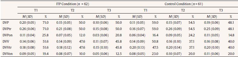 Considering the reciprocal pattern of adolescent dating aggression and dyadic influences (Chiodo et al., 2012; OLeary et al., 2008), we expected that changes in ones own behavior would influence the dating partners behavior, thus also decreasing victimization. Nevertheless, the hypothesis that the ITP intervention would also decrease victimization of DV was not supported. Several potential explanations may account for this lack of result. The dyadic influence of ones partners behavior in the other partners behavior may require some time. However, adolescent dating relationships are characterized by a lesser level of commitment and a shorter length than partner relationships in adult life (Wekerle & Wolfe, 1999) and, thus, the influence of the intervention on DVV may not appear until later developmental stages. Nevertheless, another possibility is that the ITP intervention does not have an effect on victimization. There are no previous studies about its effect on victimization, neither in the context of romantic relationships nor in peer relationships, which hinders making conclusions and highlights the need of future research in order to clarify whether the ITP intervention is effective not only for the prevention of perpetrating aggressive behaviors but also for being a victim of aggressions.
