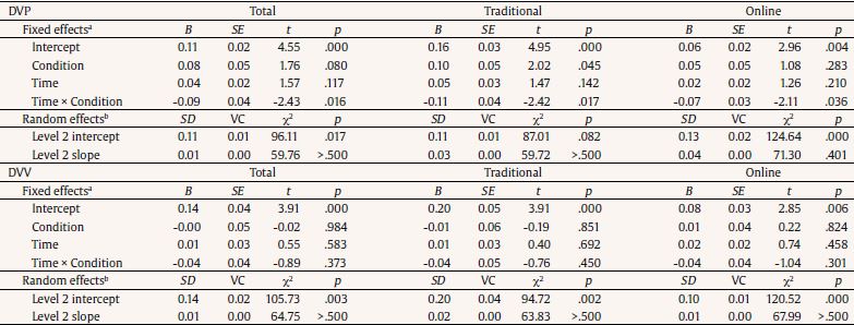 Table 2 displays the means, standard deviations, and prevalence rates of DV at the three waves of the study for the experimental and control conditions. The results of the hierarchical linear models are depicted in Table 3. The three-way interaction between time, condition and sex was not significant for any of the outcomes, DVP total score: B = -0.05, SE = 0.08, t(119) = -0.66, p = .511; traditional DVP: B = -0.04, SE = 0.09, t(119) = -0.52, p = .601; online DVP: B = -0.07, SE = 0.07, t(119) = -1.01, p = .314; DVV total score: B = 0.03, SE = 0.09, t(119) = 0.35, p = .725; traditional DVV: B = 0.00, SE = 0.10, t(119) = 0.04, p = .967; online DVV: B = 0.06, SE = 0.08, t(119) = 0.83, p = .407), and therefore, sex was excluded from the models. As can be seen in Table 3 and Figure 2a, participants in the experimental condition scored higher than participants in the control group on DVP on the intercept, which is consistent with the results obtained when comparing experimental and control conditions on DV scores at pretest through t-tests. The slopes for DVP (total score, traditional, and online) were positive, indicating an increasing tendency for perpetration of DV over time, but not significant. The interaction between time and condition was statistically significant for the total score of DVP (B = -0.09, p = .016) and for both traditional (B = -0.11, p = .017) and online DVP (B = -0.07, p = .036). As shown in Figure 2a, perpetration of aggressive behaviors toward the dating partner decreased between the pretest and the 1-year follow-up in participants in the experimental condition, whereas there was a tendency to increase over time in participants in the control condition. The effect size comparing mean change scores on DVP (total score) was 0.34 [-0.18, 0.87] from baseline to 6 months, and 0.68 [0.12, 1.25] from baseline to the 1-year follow-up. Considering the type of aggression (traditional versus online), from baseline to the 6-month follow-up, the effect sizes were 0.37 [-0.15, 0.89] and 0.27 [-0.25, 0.80], respectively; and from baseline to the 1-year follow-up, the effect sizes were 0.74 [0.18, 1.31] and 0.54 [-0.02, 1.10], respectively. In the case of DVV, the interaction between time and condition was not significant either for traditional DVV or for online DVV (see Table 3). These results indicated that there was no effect of the ITP intervention on victimization of DVV.