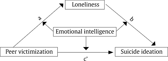 Based upon reviewed evidence, we hypothesised that loneliness might work as a mediator between both forms of peer victimisation (i.e., traditional victimisation and cybervictimisation) and suicidal ideation among adolescents (Hypothesis 1). We further posited that EI might play a role as a moderator in the direct and/or indirect effect of both forms of peer victimisation on suicidal ideation (Hypothesis 2).