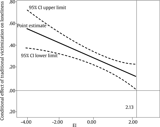 The full moderated mediation model was further tested by examining the indirect effect of traditional victimisation on suicidal ideation at different levels of EI. This factor was divided into low (mean minus one SD) and high (mean plus one SD). Loneliness significantly mediated the association between traditional victimisation and suicidal ideation when EI was low (b = 0.87, SEboot= 0.12, 95% CI [0.654, 1.122]), medium (b = 0.55, SEboot= 0.07, 95% CI [0.423, 0.696]), and high (b = 0.30, SEboot= 0.07, 95% CI [0.181, 0.449]). Johnson-Neyman’s technique was used to determine in which regions in the range of the moderator variable (EI) the effects were statistically significant and nonsignificant (Carden et al., 2017; Hayes & Rockwood, 2017). Specifically, Johnson-Neyman’s approach investigates “regions of significance” for the range or ranges of the moderator (i.e., EI) where the predictor is statistically significant and nonsignificant related to the consequent. This approach eludes the matter of arbitrarily chosen values for the moderator before probing the interaction as Johnson-Neyman’s technique provides information about the statistical significance of the effect of the predictor for all values of the moderator one could choose (Hayes & Rockwood, 2017).