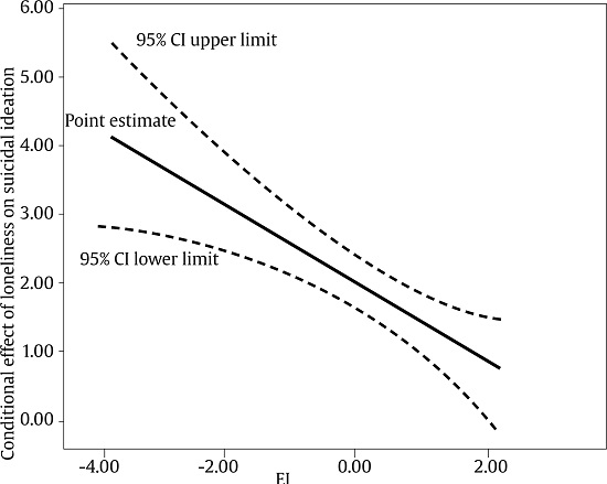 As Figure 2 shows, Johnson-Neyman’s technique indicated that EI could moderate the relationship between traditional victimisation and loneliness when EI standard scores were lower than 2.13, in which a 95% CI did not include zero. Similarly, Figure 3 indicates that EI could moderate the association between loneliness and suicidal ideation at any value.