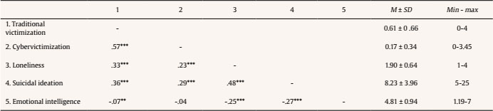 Table 1 provides Pearson’s correlations, means, and standard deviations among variables studied. Results indicated that both forms of bullying were negatively related to suicidal ideation. Loneliness was negatively associated with EI and positively correlated with suicidal ideation. In addition, EI had a significantly negative relation to suicidal ideation and a significantly negative association to traditional form of victimisation.