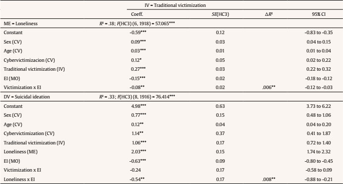 To sum up, EI moderated indirect paths of the mediation process for traditional victimisation: path a (the impact of traditional victimisation on loneliness), path b (the impact of loneliness on suicidal ideation). Thus, for traditional victimisation, the results partially supported Hypothesis 2.