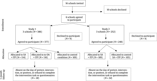 Participants and procedure. We invited a random sample of 16 high schools in Alava (Basque Country, Spain) to participate. Of them, the headmasters of three private schools agreed to participate in Study 1. Although participants had received some educational talk related to Internet risks, the schools reported that they had not received any previous intervention program related to the subject matter of the study. Figure 1 displays the participation process through the different waves of the study. The final sample comprised 339 adolescents (51% were male, mean age = 14.12 years, SD = 0.70) who completed the interventions and measurements at the pretest and posttest. Adolescents were studying Grades 7 and 8 (51.7% and 48.3%, respectively). Random assignment was conducted at the individual level within each classroom and blocked by sex. Out of the 339, a total of 114 participants were allocated to the SA + ITP condition, 116 to the OA + ITP condition, and the remainder 109 to the control condition. To ensure blinding of condition assignment, notebooks with task interventions were distributed in an envelope (different colors were assigned for girls and boys) and the participants individually completed the task interventions on paper.