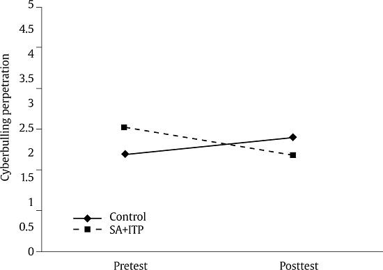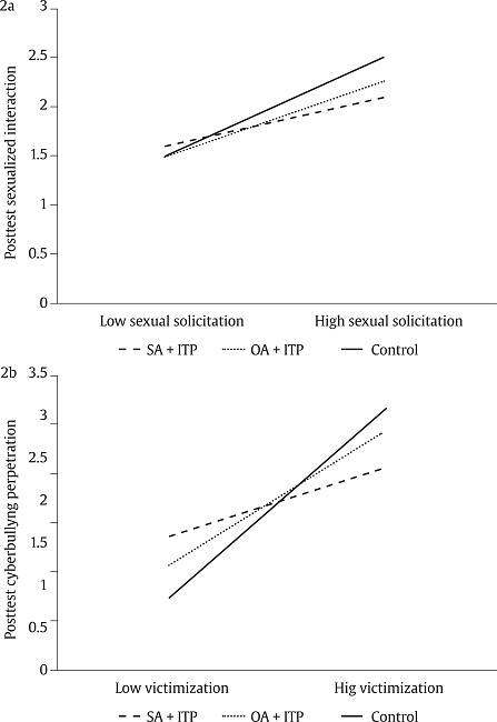Descriptive statistics and pretest comparisons.Table 1 displays mean, standard deviations, and correlations of variables. Results showed that all correlation coefficients were significant, except for the correlation between T1 sexualized interactions and T2 cyberbullying perpetration, which was marginally significant. In addition, comparisons between conditions yielded no significant differences between the experimental (SA + ITP, OA + ITP) and control groups in terms of sex, age, or the pretest measures of cyberbullying perpetration and sexualized interaction with adults.