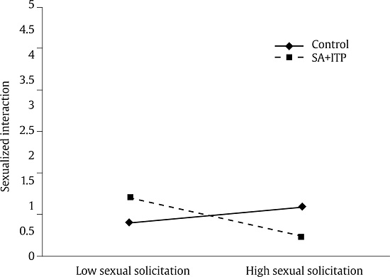 Effects of interventions on reciprocity between victimization and risk behaviors.Table 2 displays the results for hierarchical regression analyses. For sexual interaction, in the first step, pretest level of sexualized interaction significantly predicted posttest level of sexualized interaction. In the second step, sexual solicitation significantly predicted high levels of sexualized interaction, whereas the SA + ITP condition displayed a marginally significant negative effect on sexualized interaction. Finally, the interaction term between SA + ITP and sexual solicitation was statistically significant. Posthoc analyses comparing the effects for SA + ITP and OA + ITP revealed no differences for the direct effect (t = -0.69, p = .49) or the moderating effect of reciprocity (t = -1.71, p = .17). Figure 1 depicts the association between sexual solicitation and sexualized interaction under the three conditions. The figure represents levels of socialized interaction for adolescents with low (mean – 1 SD) versus high (mean + 1 SD) scores for sexual solicitation under the three conditions. As observed, association between sexual solicitation and sexualized interaction is lower in the SA + ITP condition (β = .26, t = 4.71, p < .001) than in the control condition (β = .50, t = 7.07, p < .001).
