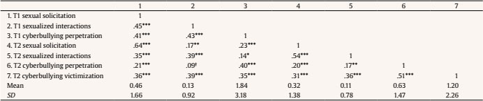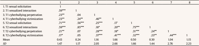 Descriptive statistics and pretest comparisons.Table 3 provides means, standard deviations, and correlations of variables. Correlations between study variables were significant, except for correlations between T1 sexualized interaction solicitation and T1 cyberbullying perpetration and between T2 cyberbullying perpetration and T2 cyberbullying victimization. In addition, comparisons in the pretest measures between experimental and control conditions indicated no significant differences between conditions in terms of sex, age, or sexualized interaction with adults. However, mean scores for cyberbullying perpetration at pretest were significantly higher for adolescents in the experimental condition (M = 1.43) than the control condition (M = 0.88), t(211) = 2.00, p <.05.