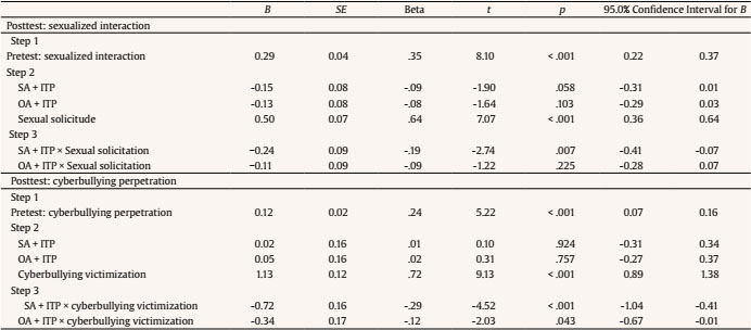 Statistical approach. A series of hierarchical multiple regression analyses with SPSS-26 were performed to test the hypothesis that the intervention moderated the predictive association between victimization and perpetration of cyberbullying and sexualized interaction in the participants. Given the three interventions, the intervention was modeled with two dummy variables that specified the effects of each experimental condition (i.e., SA + ITP and OA + ITP) by contrasting their effects with those of the control condition, which acted as the reference group. In the first step of the analyses, the pretest level of behavior was regressed on the posttest level of behavior. In the second step, each of the two experimental conditions and the level of victimization for the previous month were included as predictor variables. Finally, in the third step, interaction terms between intervention conditions and victimization were included. Following standard procedures, the study transformed victimization and pretest levels of behaviors into z-scores to maximize interpretability. Preliminary analyses also examined the role of sex and age as predictors of outcomes and potential moderators of the intervention. Data is available at https://osf.io/hkys9/.