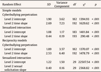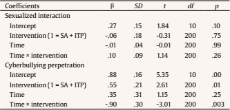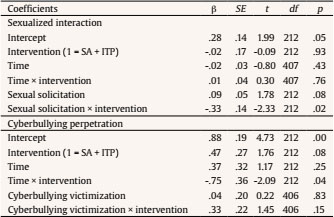 Statistical Analyses. Hierarchical linear modeling was used with robust standard errors and full information maximum likelihood, a method recommended to manage missing values when they are not distributed randomly, with HLM8. Separate models for cyberbullying perpetration and sexualized interaction were estimated. At level 1, regression equations modeled the variation in the repeated measures as a function of time (0 = pretest, 1 = posttest). At level 2, equations represented individual differences at level 1 parameters (i.e., intercepts and slopes) as a function of the condition (0 = control, 1 = SA + ITP). Sex and age were controlled in the analyses. Random effects for intercept and time were included at level 2 for all models to consider variability between individuals at the initial levels and changes over time. Nonsignificant random effects were removed from the final models.