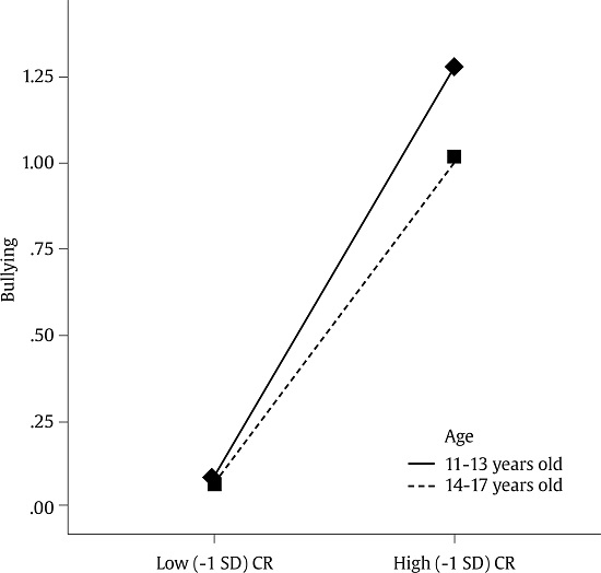 The interaction between age and cognitive restructuring was significant for traditional bullying (B = -0.15, p < .001, d = 0.24;R2 = .012, p < .001), what indicates that the effect of cognitive restructuring on bullying differed for younger and older schoolchildren (see Figure 1). Simple slope analyses showed a positive association between cognitive restructuring and bullying for the youngest (ßsimple = .54, p < .001), and the oldest (ßsimple = .46, p < .001). Follow-up analyses showed that the effect of cognitive restructuring on bullying was significantly different for younger and older classmates at high (ßsimple = -.07, p = .03) but not at low (ßsimple = -.02 p = .42) levels of cognitive restructuring. This indicates that younger students are more inclined than older to engage in bullying if they score high on cognitive restructuring whereas there are no differences between ages to engage in bullying if they score low on cognitive restructuring.
